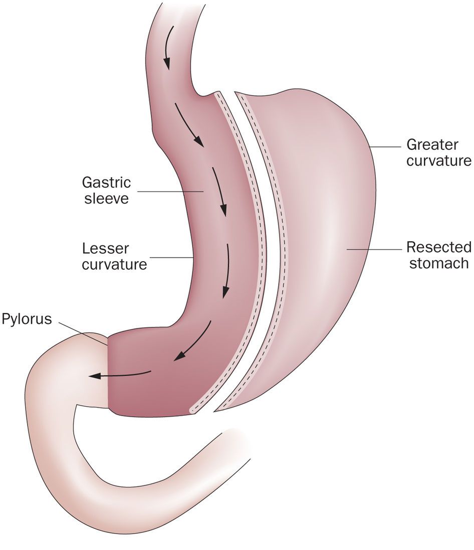 75% of the stomach is removed leaving a narrow tube or sleeve like stomach.